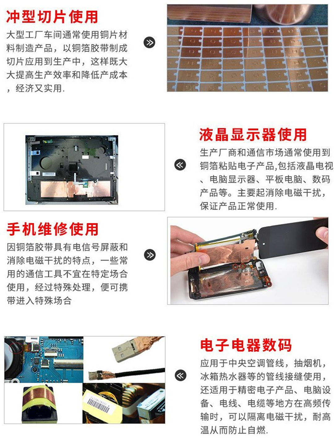 | 加工定制 | 支持模切深加工 | 适用场景 | 广泛用于需要导电、散热、电磁屏蔽作用的电子数码产品内部元器件的装配 | ||